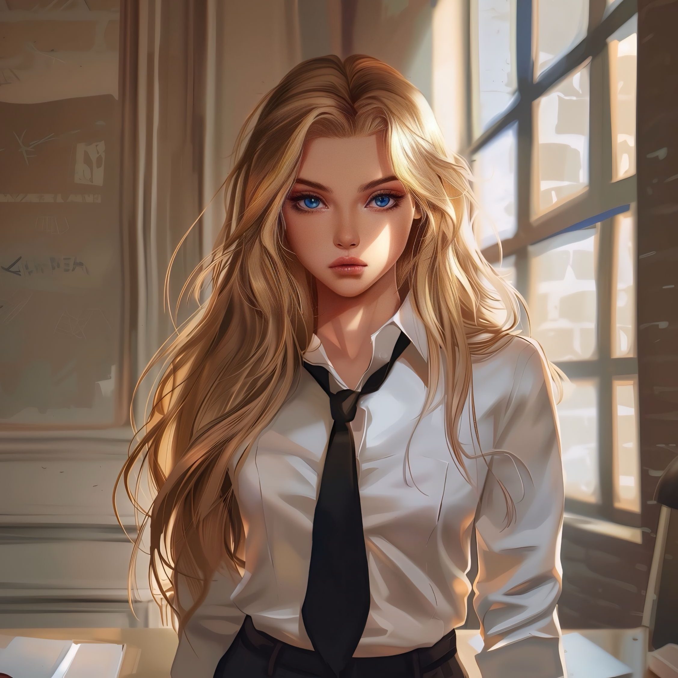 - FEATURES: deep-yet-indecipherable eyes, long blonde hair, exceptionally attractive/feminine features